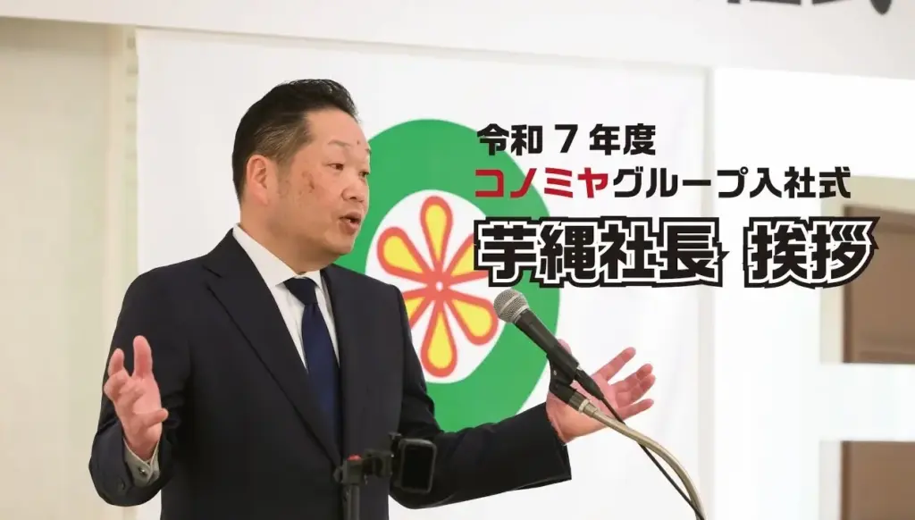 「令和 7 年度コノミヤグループ入社式」における、芋縄社長による挨拶です。 -